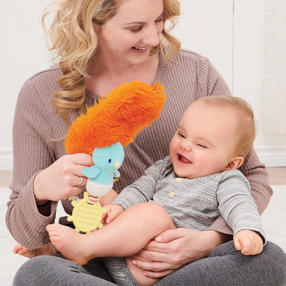 This first toy for baby features a soft feather, crinkle, rattle, teether and plush toy all in one!