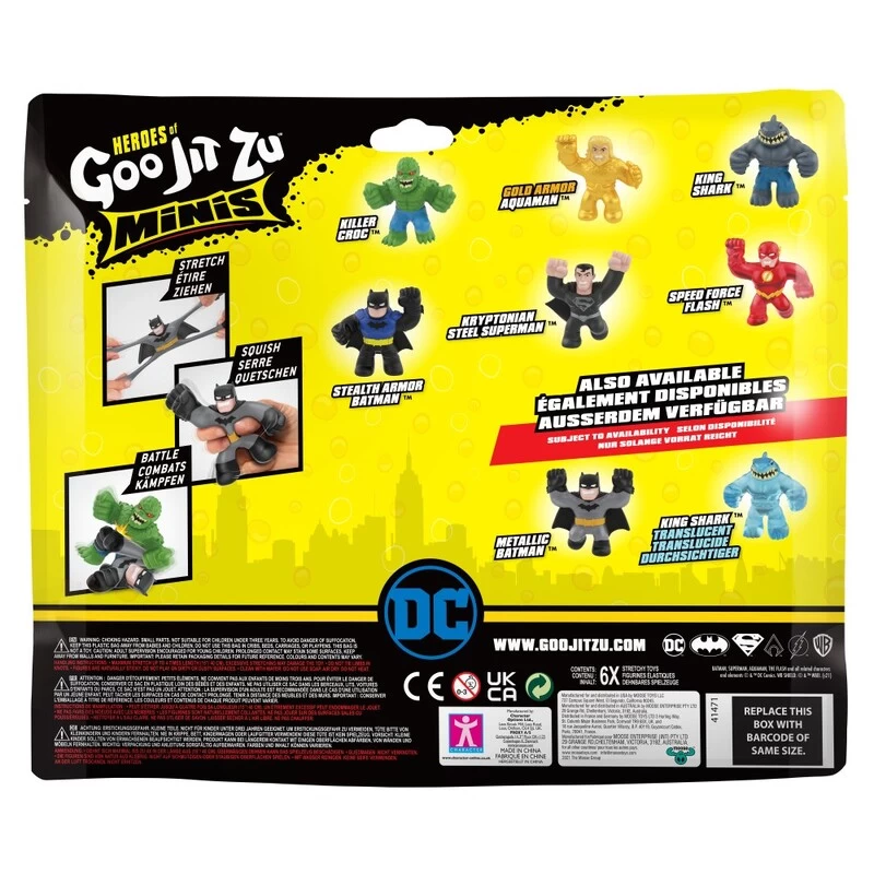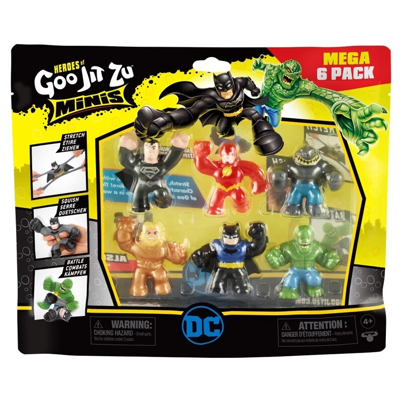 This Mega 6 Pack contains 6 of your favorite DC Superheroes! Many of your favorite DC Heroes are available in this Mini Goo Jit Zu range including Stealth Armor Batman, Gold Armor Aquaman, Speed Force Flash, Killer Croc, King Shark and even Kryptonian Steel Superman! Discover a new way to play and save the day with these cool collectible toy Mini DC Heroes of Goo Jit Zu!