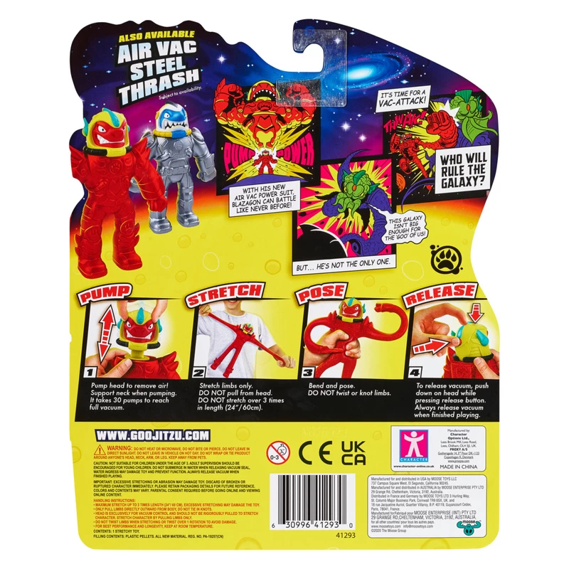 Squeeze, squish, stretch and collect both Pump Power Action Figures – Air Vac Steel Thrash and Air Vac Blazagon.