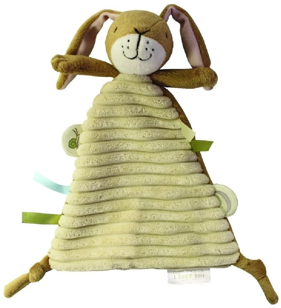 Little Nutbrown Hare plush holding a soft comfort blanket made with soft boa and corduroy fabrics with knotted ends.